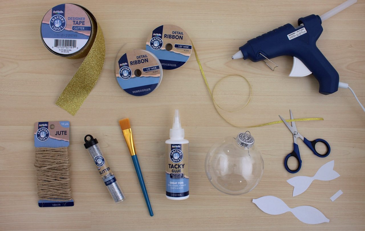 To make the glitter bow, download and print the supplied template shapes. Stick the template to the underside of the Glitter Duct Tape and cut out the shapes. Assemble and attach the bow to the top of the ornament using the hot glue gun.