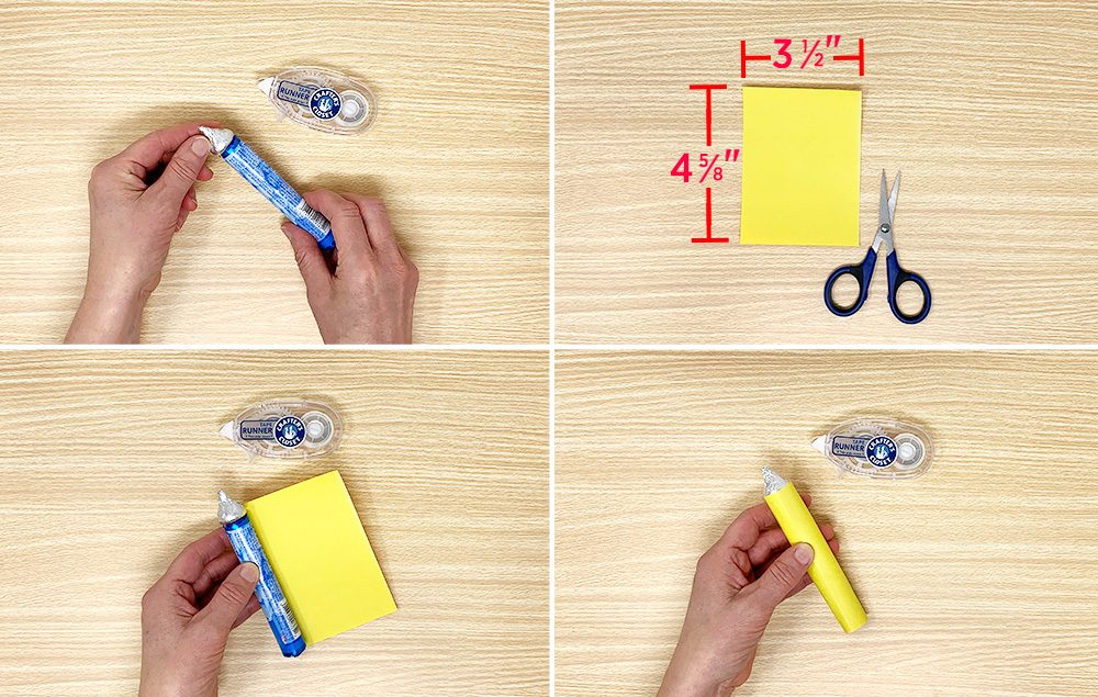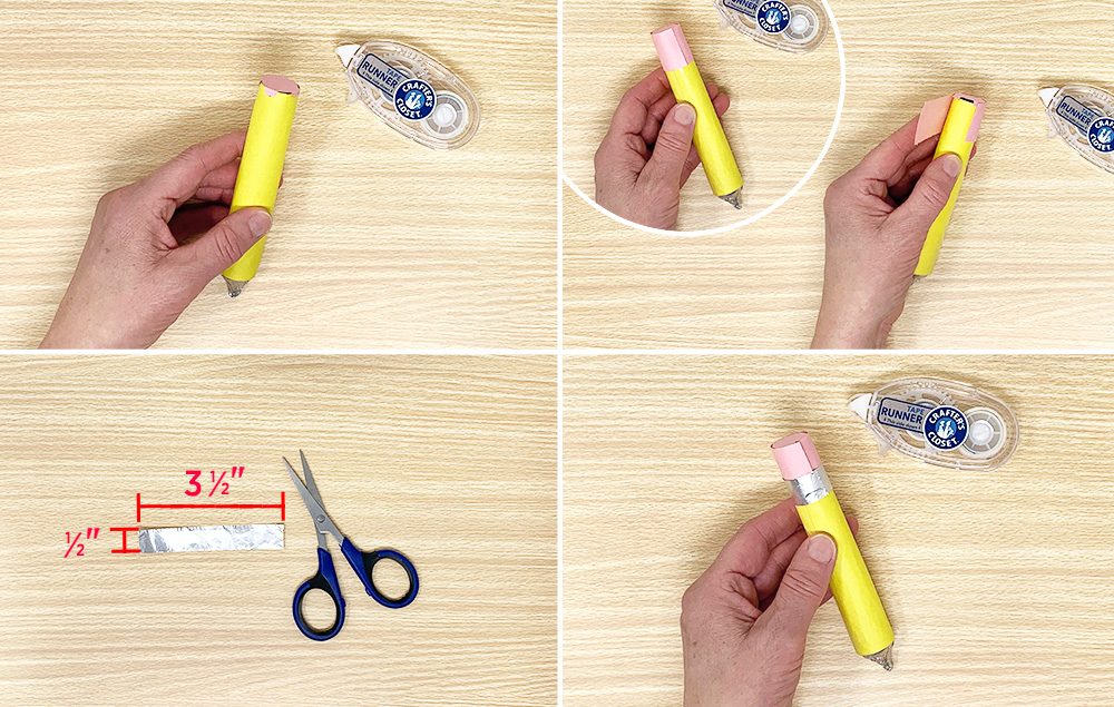 4. Apply adhesive with tape runner or double-sided tape to the remaining unattached edge of the construction paper. Wrap the yellow paper around the candy pencil, covering it completely.