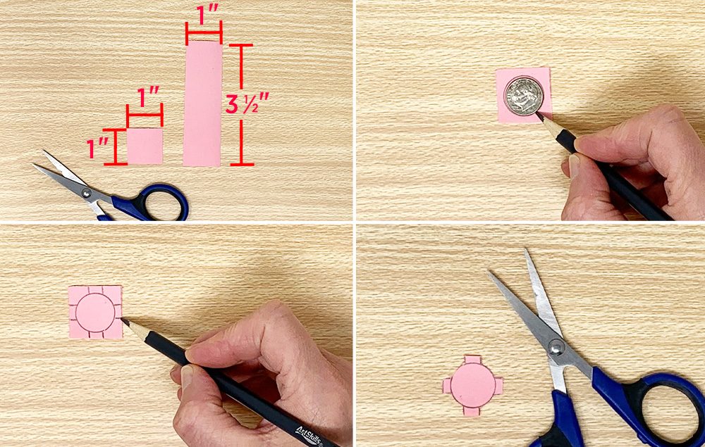 1. Measure and cut a 1"x1" square of pink construction paper and a 1" x 3 1/2" rectangle of pink construction paper.