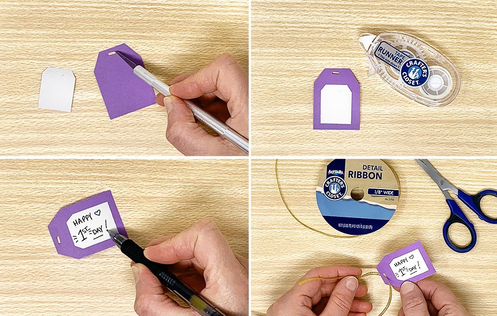 2. Use the tape runner to adhere the white tag onto the color tag, keeping both snipped ends facing the same direction.