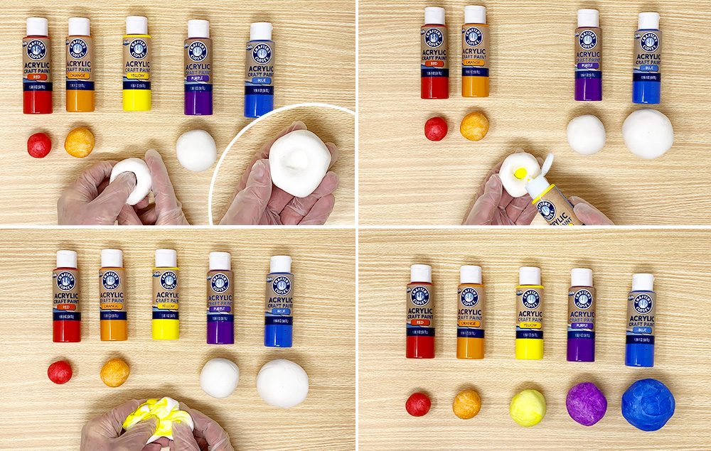 Wearing gloves, add paint to the balls. Tip: Press your thumb into the center of the ball to make a placeholder for the paint.