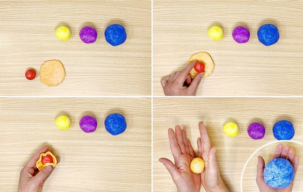 Flatten out the next biggest color ball and wrap it around the smallest ball. Tip: Place the smaller ball in the center of the flattened ball.