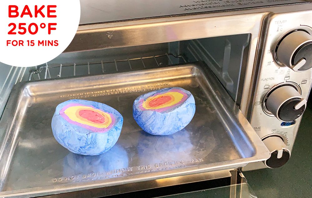Bake clay Earth at 250° F for approximately 15 minutes. Periodically check the Earth to watch for any cracking in the clay.